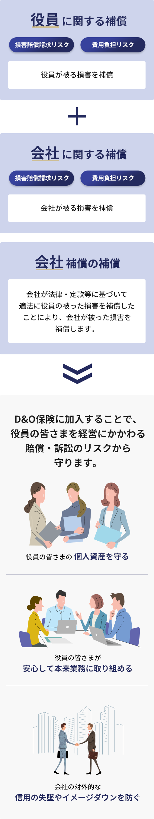 株式会社の場合は、会社法で定められている取締役、会計参与、監査役の三役の他、社外取締役も補償範囲となります。支配人その他の重要な使用人(管理職従業員)、執行役員など、法律で定義された役員以外の役職につきましては、プランによってご加入いただける保険会社もあります。詳しくはお問い合わせください。